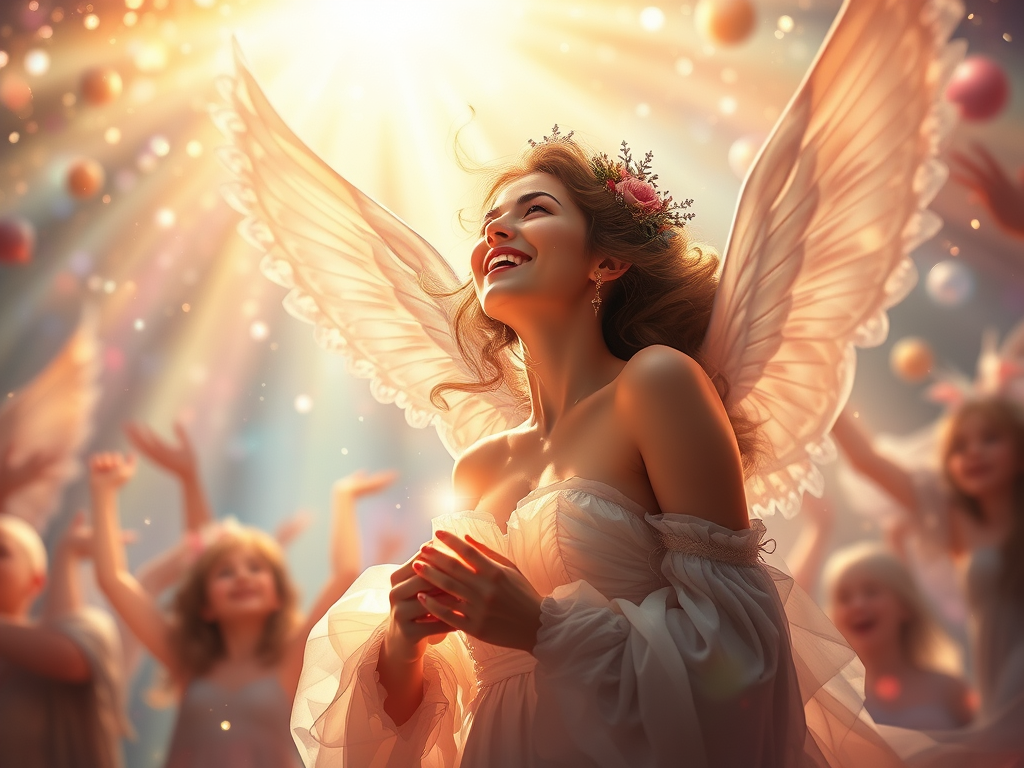 A pink figure, elevated from the earth, dances with a violin in hand—radiating joy, pleasure, and authenticity. Others watch in admiration, celebrating their presence. Coins fall from the sky, symbolizing the flow of energy and abundance.